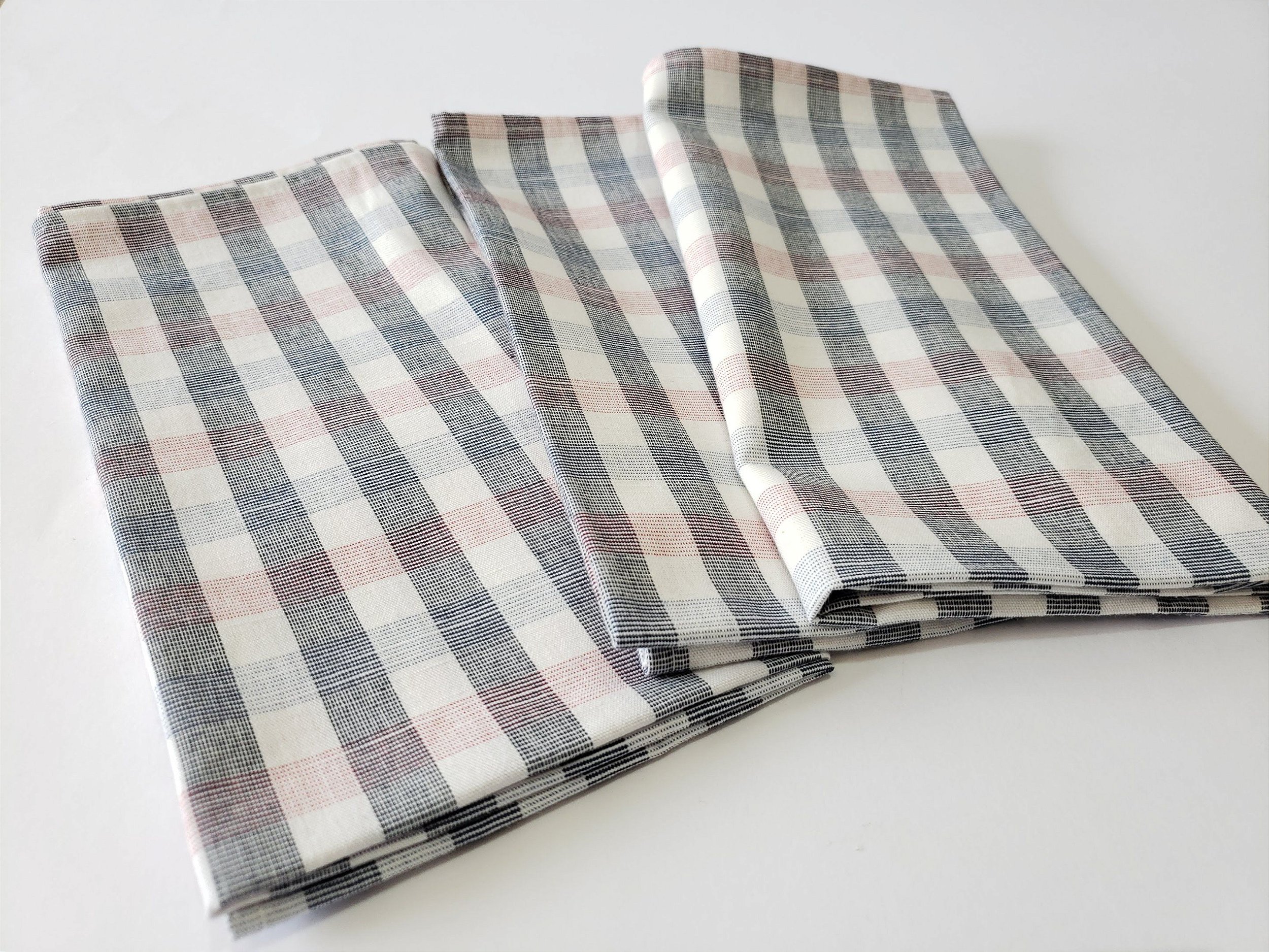 Guardanapo xadrez vermelho ,branco e azul ,bainha simples nas extremidades.