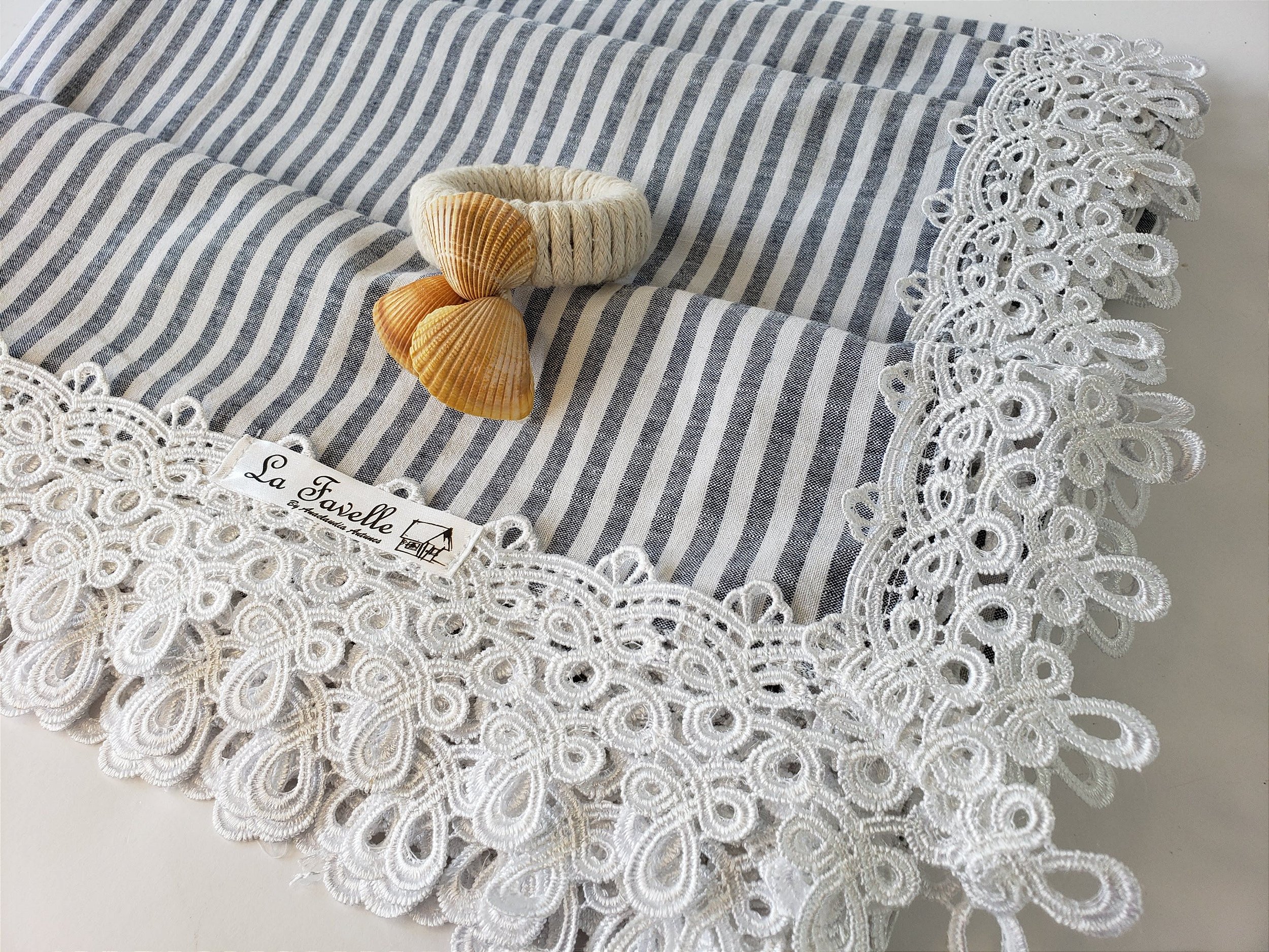 toalha de mesa listrada. toalha de mesa retangular listrada. Em tecido 100% algodão. toalha listrada cinza e branco,aplicado renda guippir nas extremidades. toalha de mesa retangular. toalha mesa listrada .
