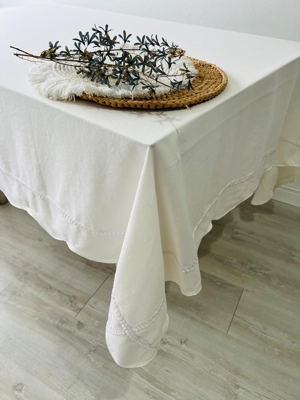 Toalha de mesa retangular com rendas e aviamentos extremidades curvas com debrum acetinado .
