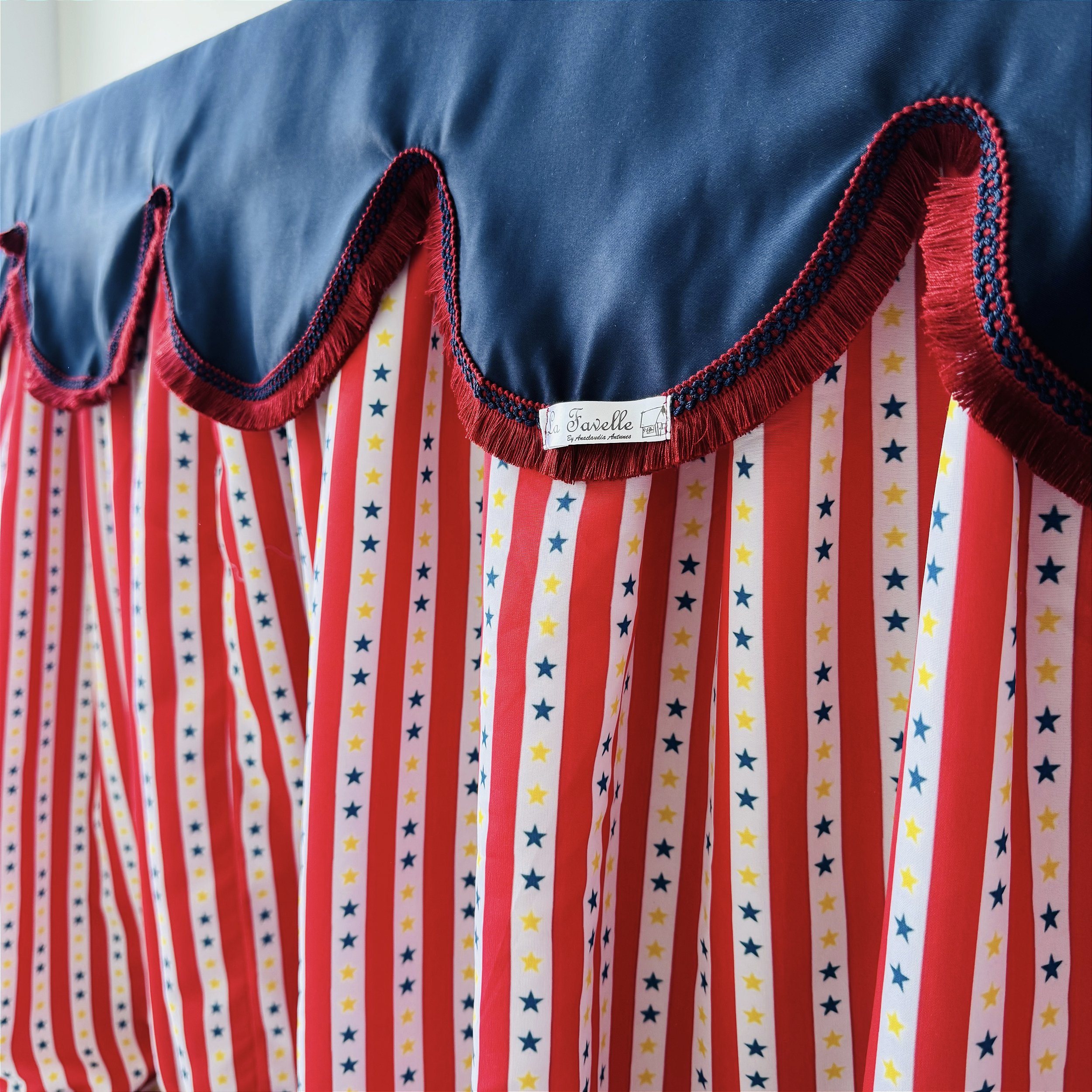 - Camada inferior com babados listrados e estampas de estrelas para dar um toque lúdico.