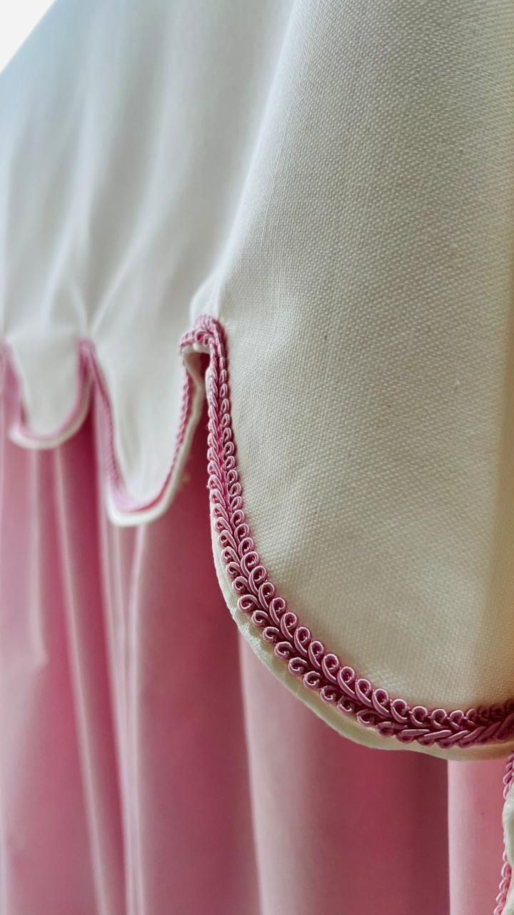 tampo em tecido misto branco, babados em tricoline mista cor de rosa .