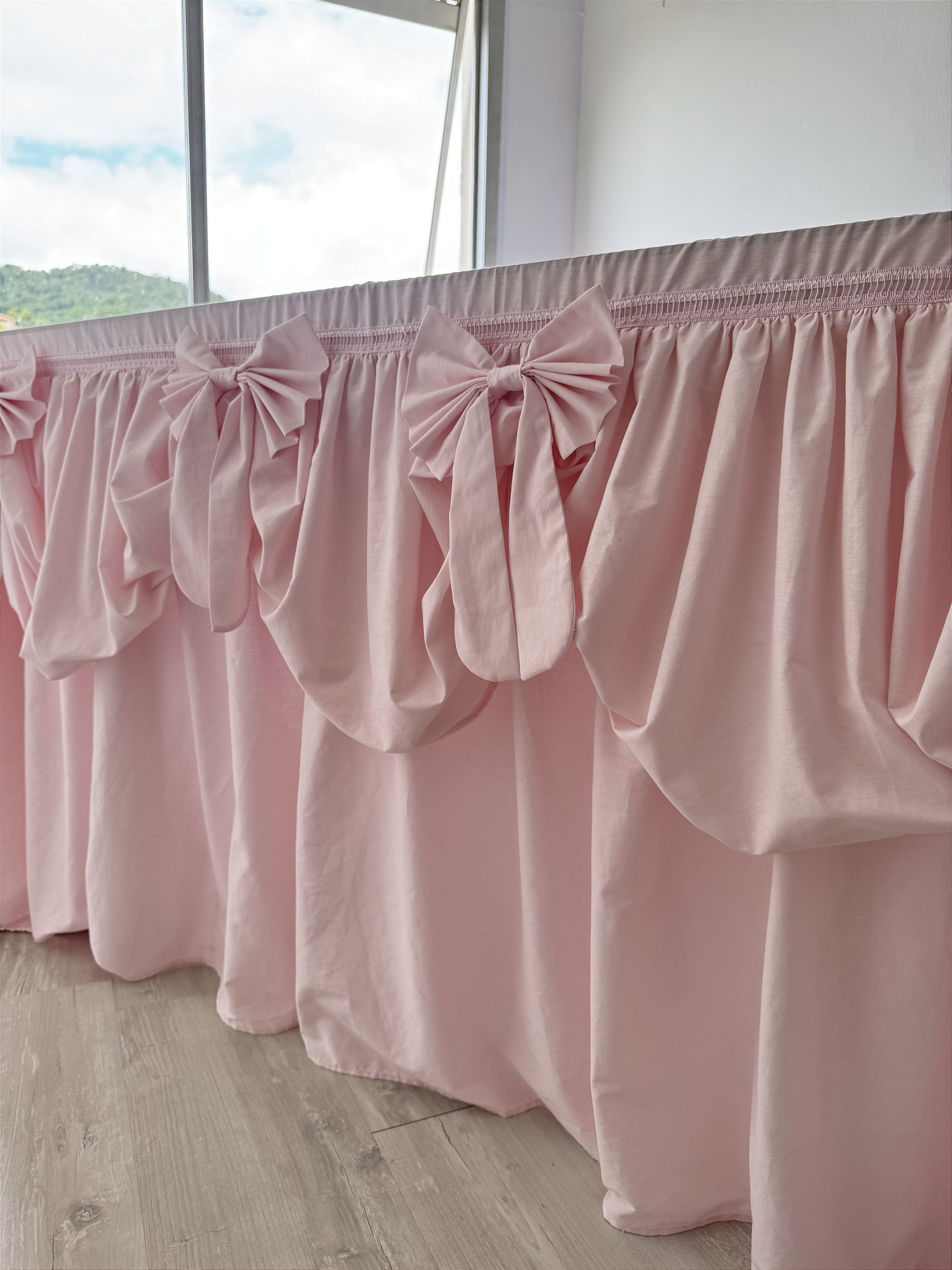 Toalha de mesa ideal para festas, com acabamento em babados e laços que dão charme à decoração. A peça é feita em tecido 100% algodão, garantindo conforto visual e toque macio.